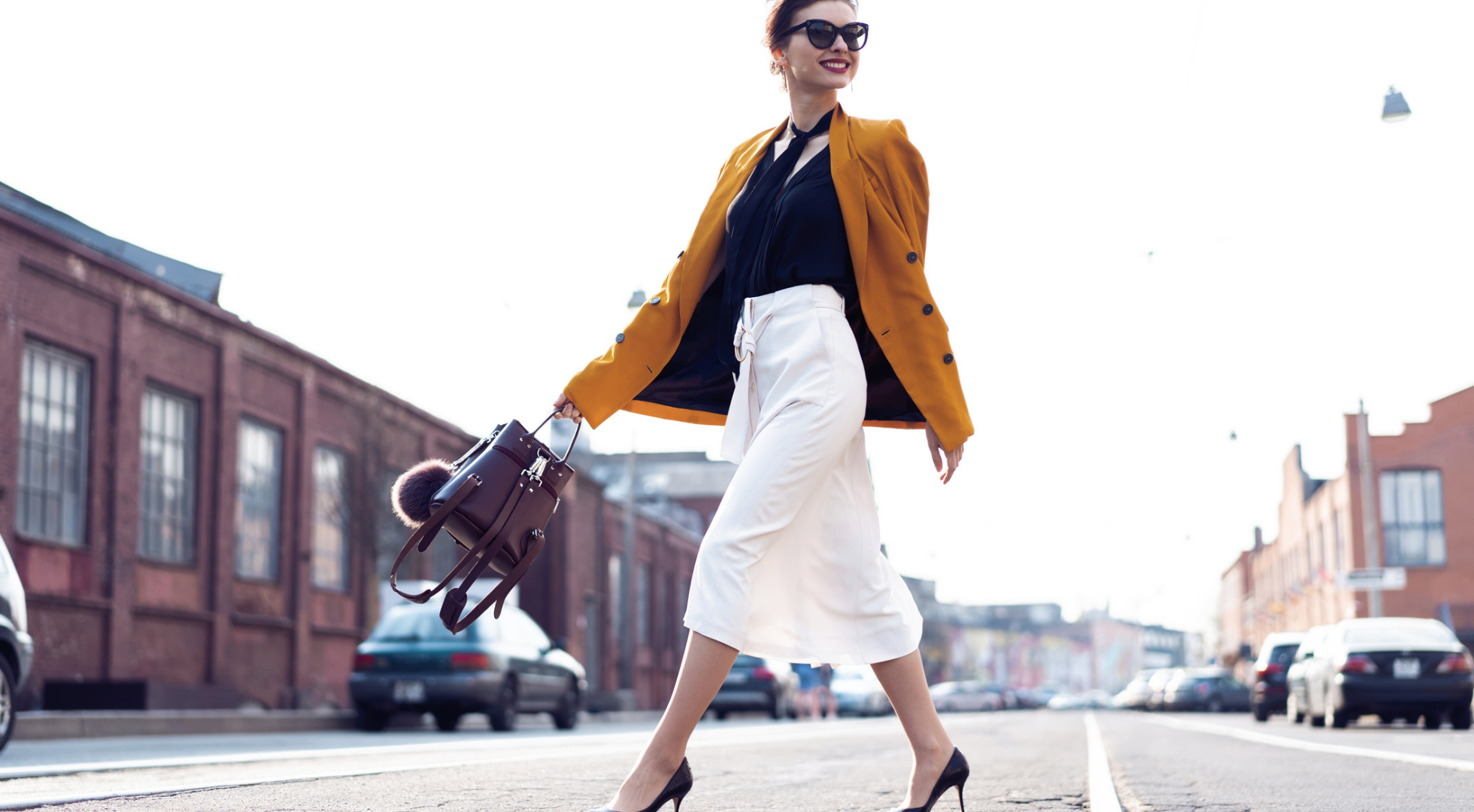 Wear the blouse. Carry the bag. Put on the heels.